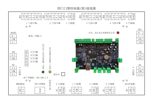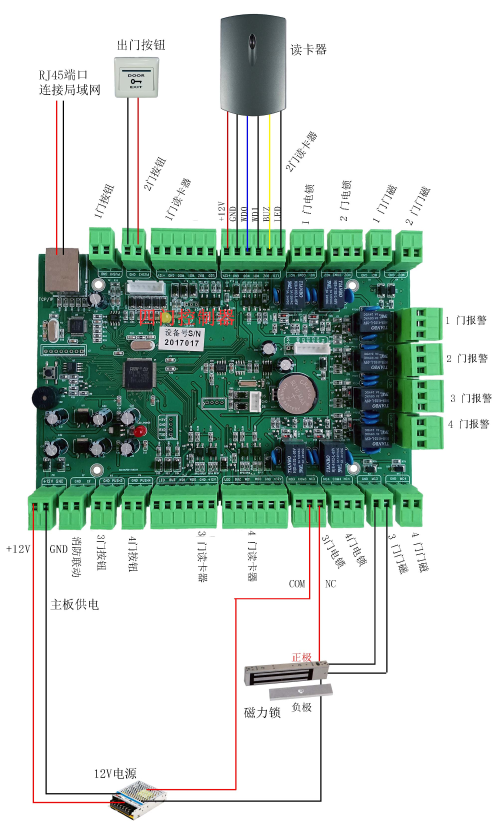 网络四门控制器,采用国产中科芯CKS(或美国STM公司)32位ARM7主控单片机,进门或出门刷卡/出门按钮开门,控制四个门的门锁,内部运行RTOS实时操作系统和FAMS2存储管理系统. |