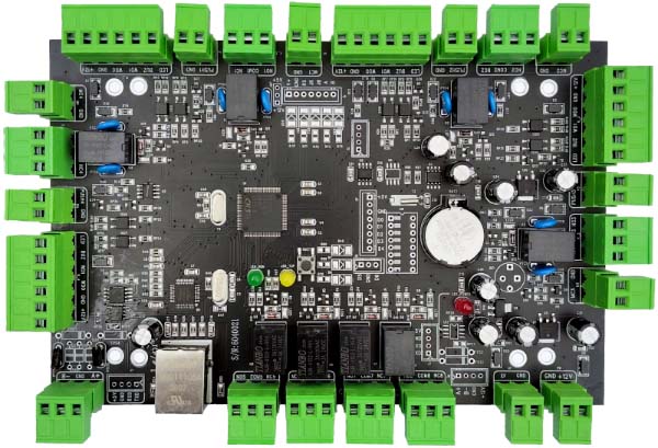 网络四门控制器,采用国产中科芯CKS(或美国STM公司)32位ARM7主控单片机,进门或出门刷卡/出门按钮开门,控制四个门的门锁,内部运行RTOS实时操作系统和FAMS2存储管理系统. |